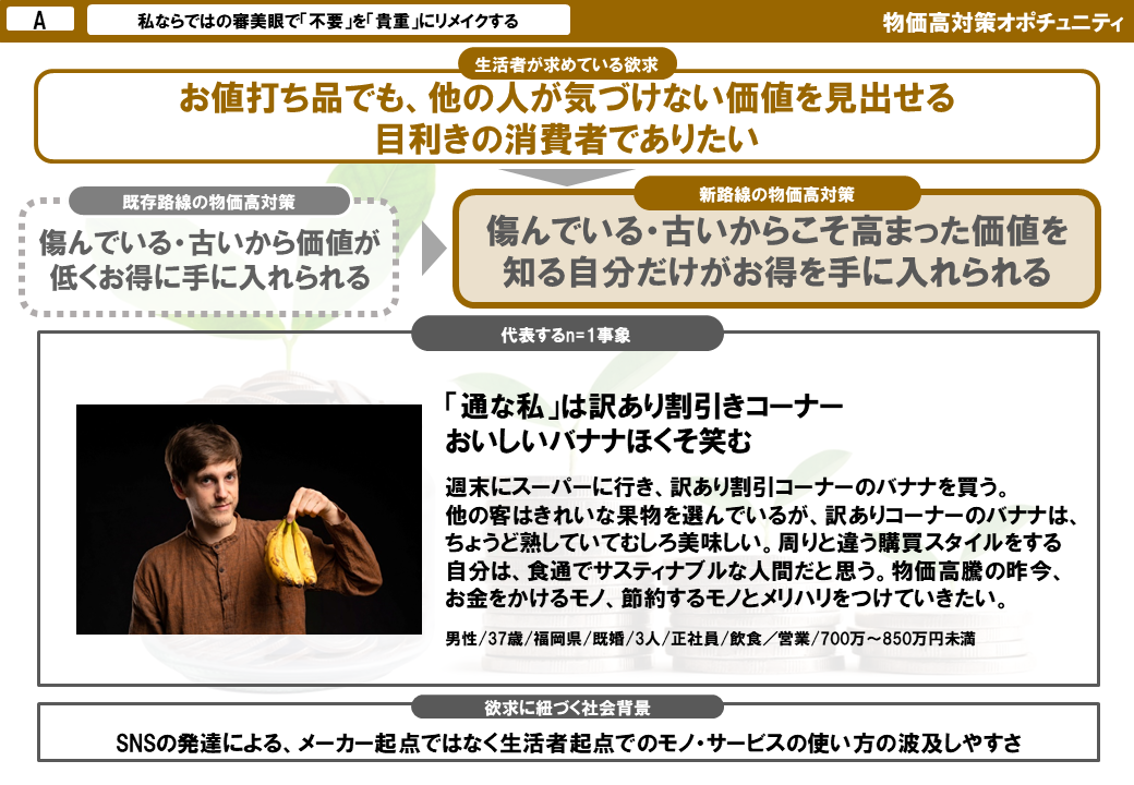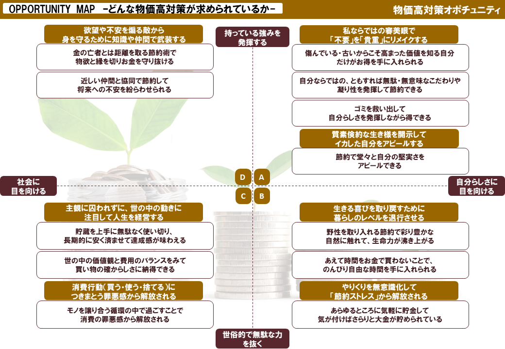 - ・【マーケ示唆】「節約しながら豊かになる」体験を商品・サービスに組み込むことで、生活者の矛盾を救済できる。