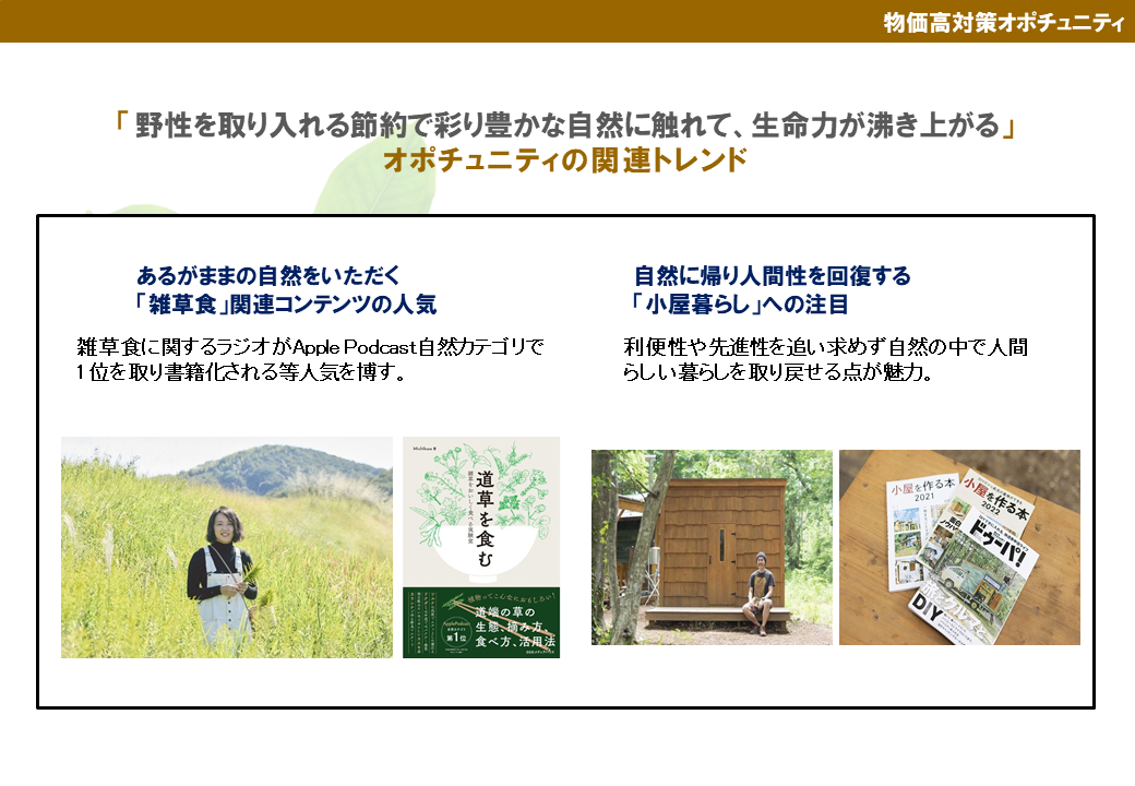 - ・【社会トレンド】雑草食や小屋暮らしへの関心の高まり。節約と自然回帰の掛け算。
