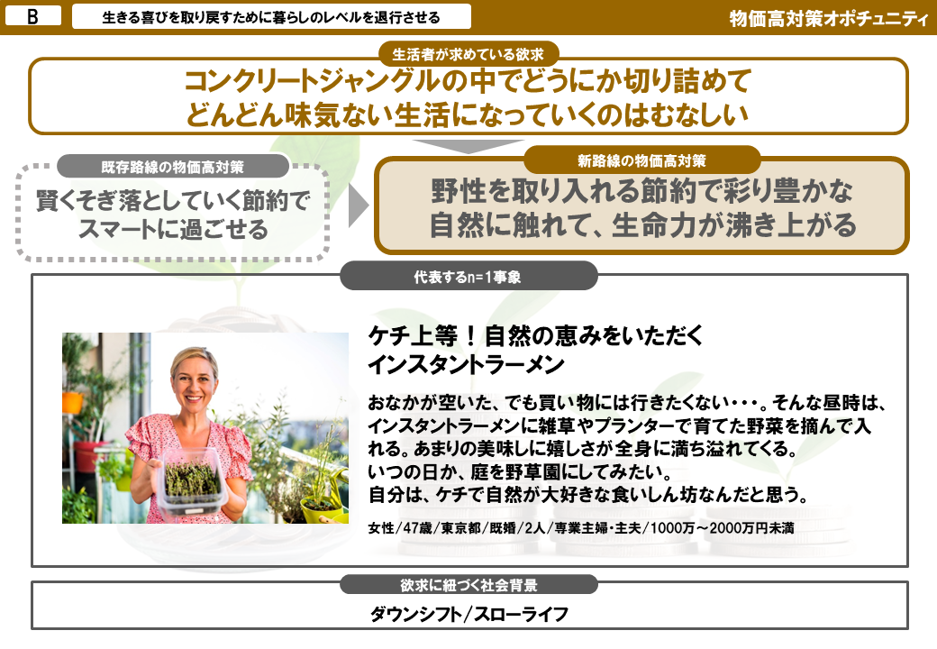 - ・【欲求】「灰色の節約生活に埋もれたくない。自然を取り入れて生命力を取り戻したい」
